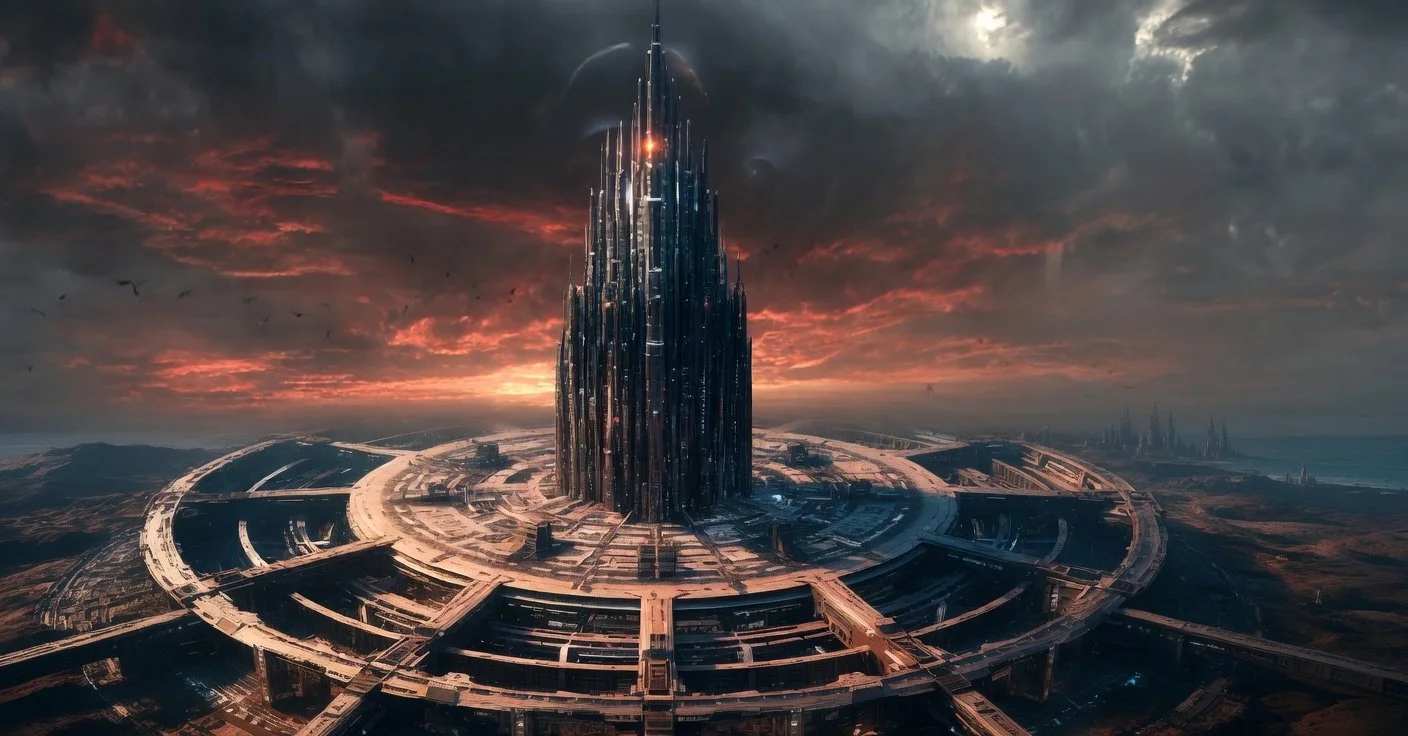 A low tone rose — not sound so much as pressure in the bones. The spire’s core flared orange-red, brighter than any sunrise Dingir Zi had ever known. Far below, in the radial arms and the encircling toroidal rings, crimson tubes began to fill. One by one, then in waves, then in a silent avalanche of light. The air itself shimmered as zi was pulled from the very lattice of atmosphere, from the magnetic breath between moons, from the dark currents that had once been called the “tears of the void.”