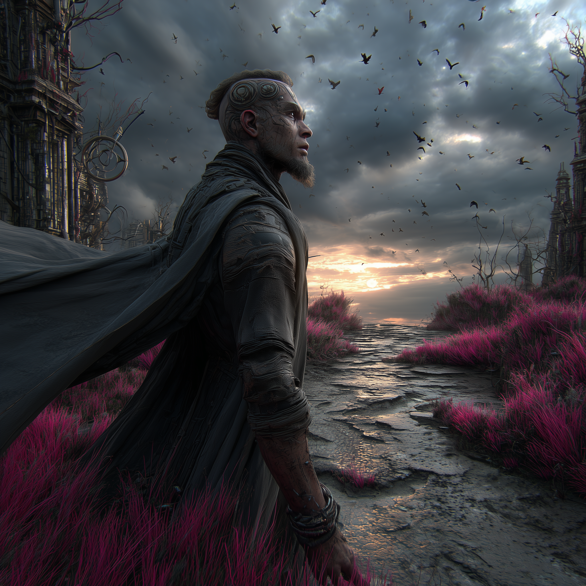 The pink moss fields that carpeted the lower terraces had gone matte gray. The floating pollen lanterns that normally drifted in lazy spirals were falling, one after another, like dying stars. In the distance, where the secondary spires met the sea, flocks of long-necked zi-raptors spiraled downward in perfect silence, wings folding as though gravity had remembered an old debt.